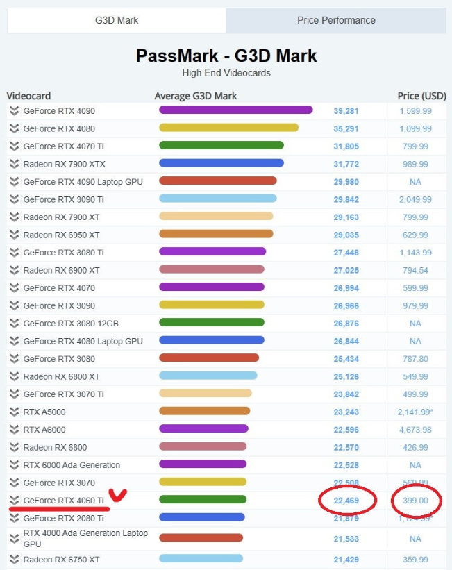 RTX 4060의 가격은 약 399달러로 책정되어 있습니다. 이 가격대에서 제공하는 성능은 매우 경쟁력이 있습니다. 아래의 차트는 다양한 고급 그래픽 카드의 평균 G3D Mark 점수와 가격을 비교한 것입니다.